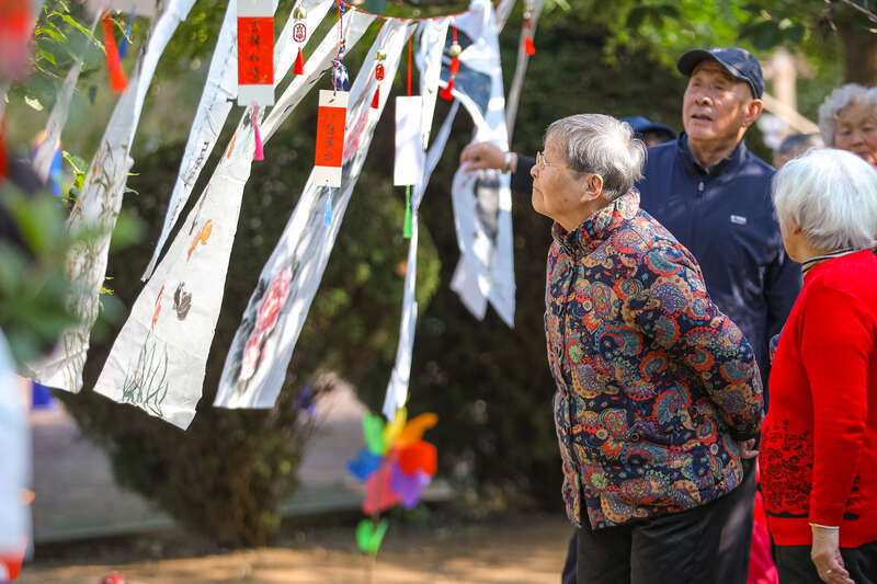 10月28日,山东青岛,李沧区社会福利院开展“爱满重阳”主题活动,老人们欣赏书画作品展。视觉中国供图