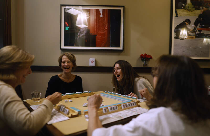 当地时间10月28日,美国旧金山,凯利·戴克、南希·韦伯、詹妮弗·哈特菲尔德和乔·拉博在龙井麻将馆玩麻将。麻将这项起源于中国的百年棋牌游戏,在社交媒体趋势、名人代言以及疫情后人们对线下社交的渴望推动下,正经历着人气飙升。视觉中国供图