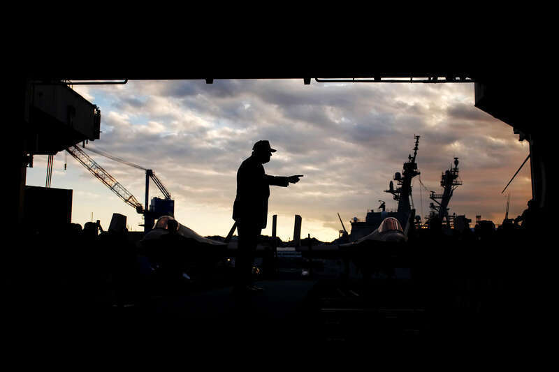 当地时间10月28日,日本横须贺,美国总统特朗普抵达横须贺基地,在“乔治·华盛顿”号航空母舰上向部队发表讲话。特朗普刚结束在马来西亚举行的东盟峰会,随后将前往韩国参加亚太经合组织(APEC)第三十二次领导人非正式会议。视觉中国供图