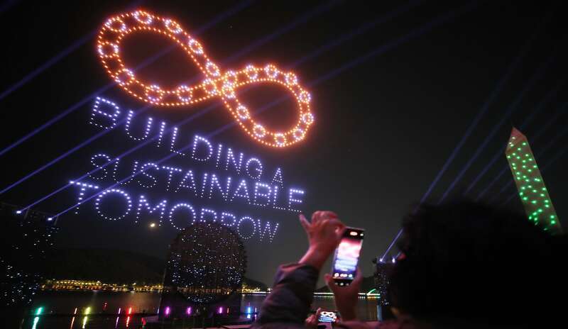 10月27日,韩国庆尚北道庆州市,为迎接亚太经合组织(APEC)第三十二次领导人非正式会议,一场多媒体表演在普门湖举行。视觉中国供图