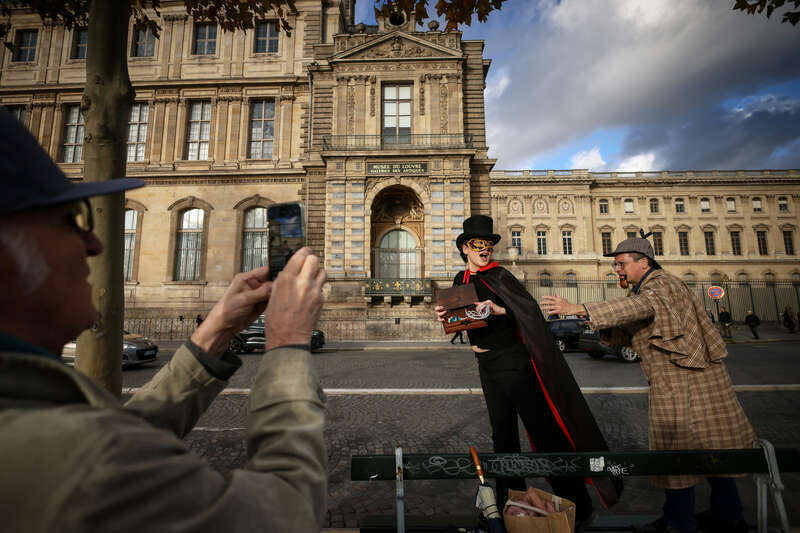 当地时间10月25日,法国巴黎,一名男子正在拍摄巴黎福尔摩斯协会成员劳伦斯·德洛伊西翁(打扮成亚森·罗宾)和蒂埃里·吉利伯特(右,打扮成夏洛克·福尔摩斯),他们正在重演上周日盗贼从卢浮宫博物馆外墙和窗户进入盗窃的场景。视觉中国供图
