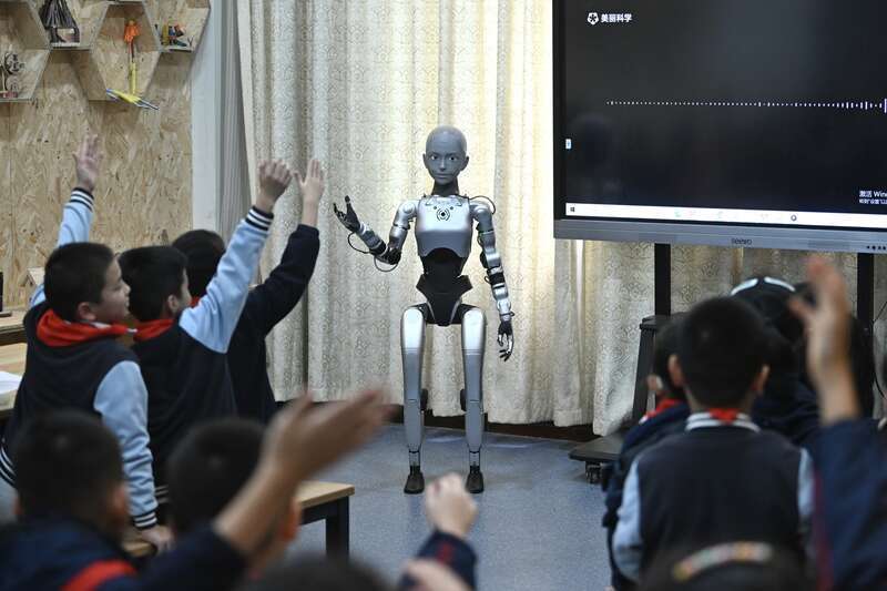 10月27日,安徽合肥,全球首款全尺寸仿生教育机器人亮相,并与专业老师协作讲授了一堂科学教育课。该机器人名叫“小安老师”,身高1.4米,重达35公斤,由当地一家公司自主研发。在40余分钟的授课过程中,机器人不仅能为学生讲课,还可与学生实时互动、解答疑问。视觉中国供图