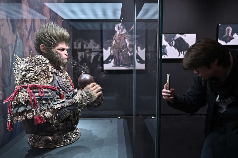 10月29日,山西太原,媒体记者参观《黑神话:悟空》中的游戏角色模型。当日,《黑神话:悟空》遇见山西——古建数字艺术展举行媒体开放日活动。该展以游戏《黑神话:悟空》为引,将数字幻想世界与微缩古建场景融合,展现山西古建筑的魅力。视觉中国供图